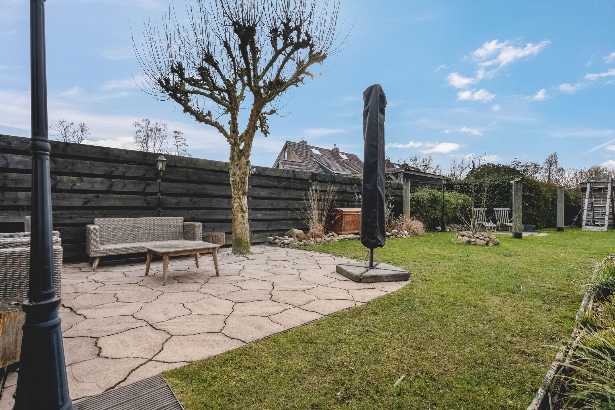 Zeer diepe (29 meter) verzorgde en zonnige achtertuin met houten berging en houtopslag. Hier geniet u van optimale privacy en rust tot in de late avonduren dankzij de gunstige ligging op het zuidwesten.