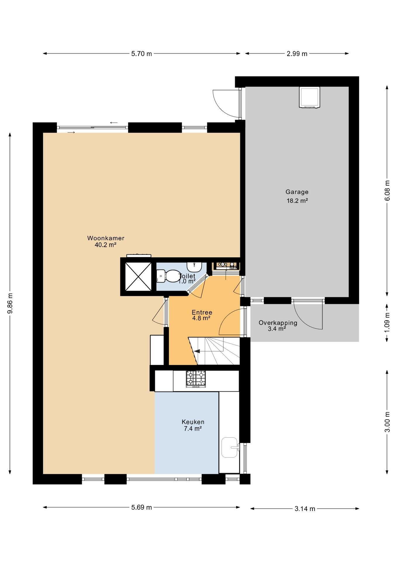 Hal/entree met toilet. De straatgerichte woonkeuken en de tuingerichte woonkamer vormen samen een royale leefruimte van circa 48 m². De woonkamer is voorzien van een open haard en een schuifpui naar de diepe, besloten achtertuin op het zuidwesten. Vanuit de gang is de grote inpandige garage bereikbaar.