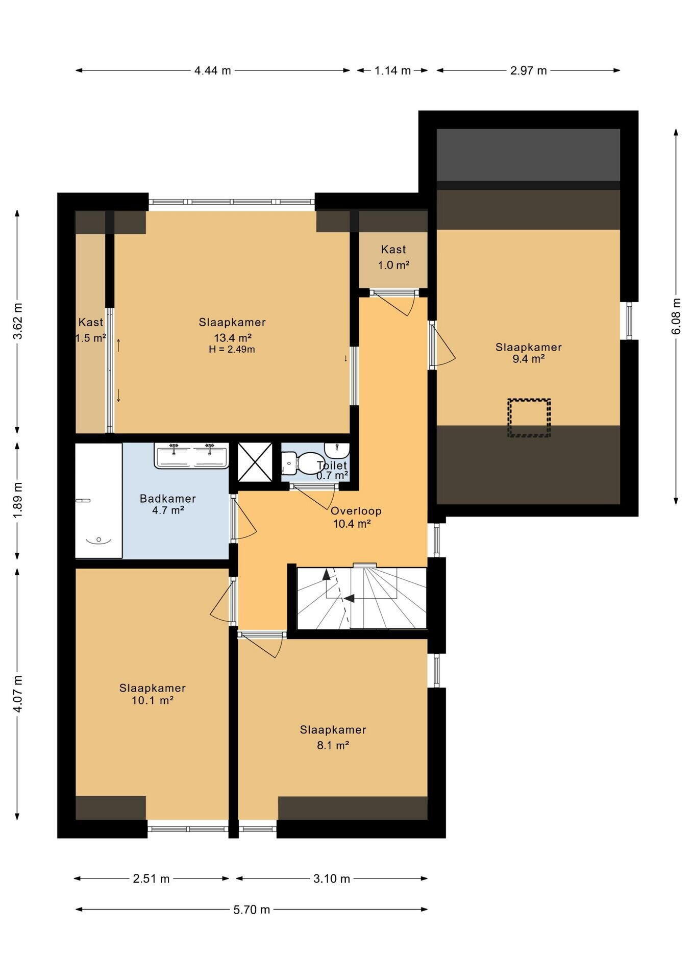 Overloop met bergkast, vier slaapkamers (circa 8 m², 9,5 m², 10 m² en 13,5 m²), moderne badkamer met ligbad/douche en wastafelmeubel, separaat toilet.
